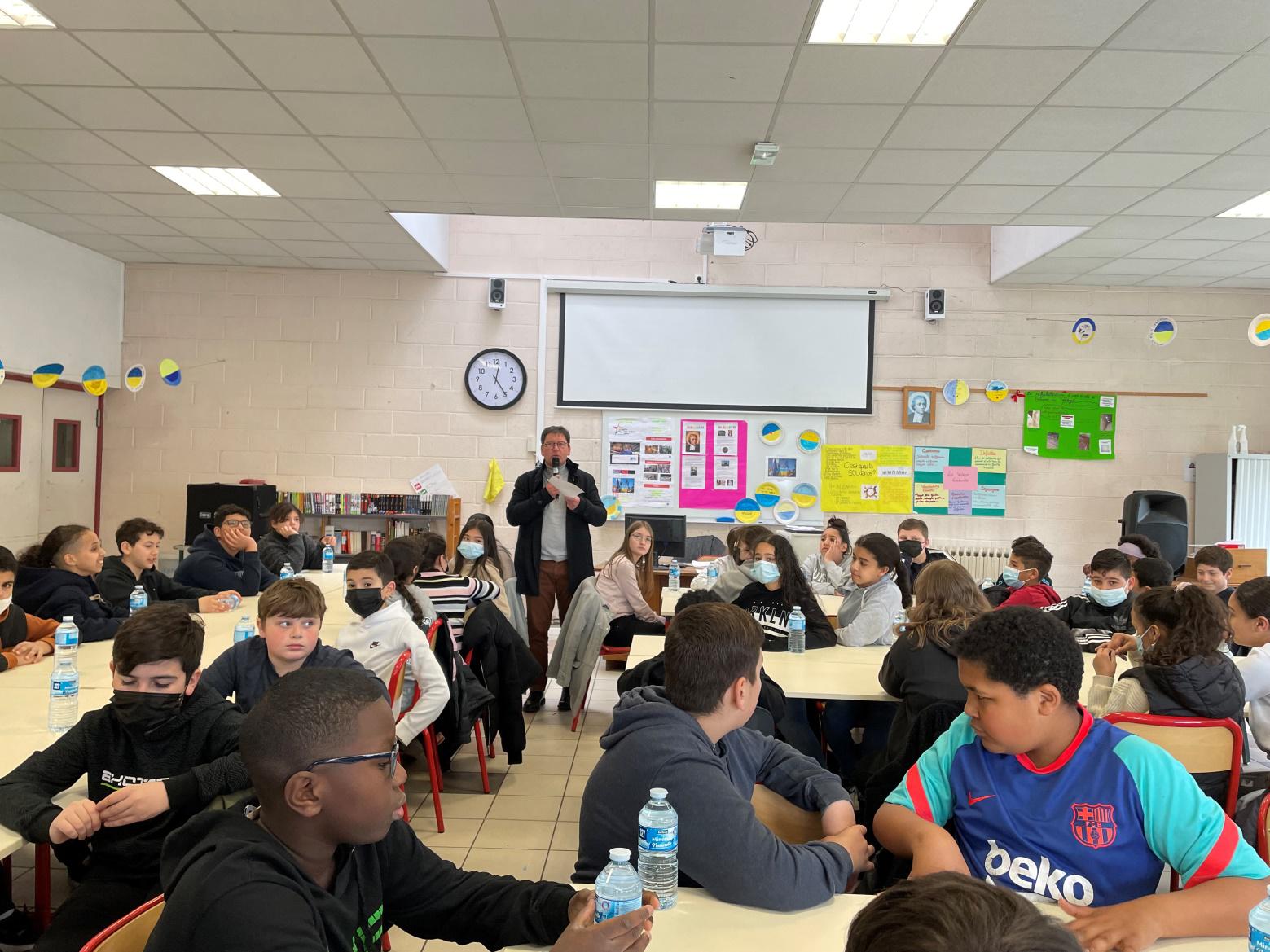 Jeudi 31 mars 2022, les élèves du niveau 6ème du collège Lasalle Ste Marie ont eu l’occasion de vivre un repas différent où chacun s’est engagé à se priver un petit peu. En effet, en ce jeudi saint, il a été proposé aux élèves de participer à un repas « pain-pomme ». Les collégiens ont partagé ensemble un repas frugal en pensant aux enfants ukrainiens à qui les bénéfices de cette action seront offerts par l’intermédiaire du Secours Catholique. Elèves et adultes ont pu vivre un moment de recueillement avec le Père Polito : « A Pâques, Dieu nous fait une belle surprise : Jésus est vivant ! ». Chacun a vécu ce moment comme une très belle action de solidarité et a montré aussi son sens de l’effort : se contenter d’un repas frugal pour offrir à manger à ceux qui en ont besoin. Les élèves de 5èmes, 4èmes, et 3èmes ont eu l’occasion de contribuer à la récolte en faisant un don à hauteur de 2 euros. Le secours catholique représenté ce jour-là par madame Véronique Segard s’est vu remettre un chèque de 230 euros. En retour, les bénévoles du Secours Catholique ont exprimé leur gratitude dans une lettre à l’intention des élèves du collège. Merci également aux mamans de l’ APEL qui ont préparé ce moment convivial.